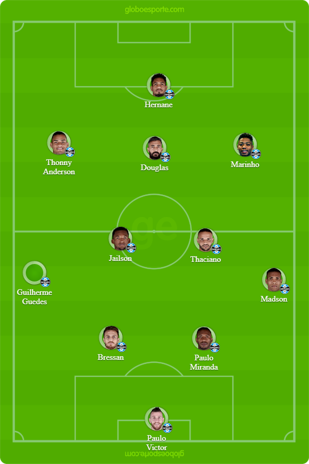 Quem está fora: Cícero, Ramiro e Kannemann (suspensos), Marcelo Grohe, Geromel, Maicon, Luan, Everton, Jael, André, Leonardo e Marcelo Oliveira (preservados). Bruno Cortez e Léo Moura (com desconforto muscular).